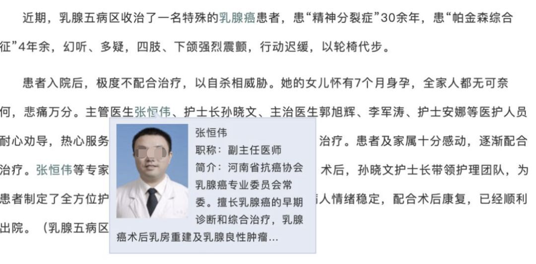 如今,河南省肿瘤医院官网上已经没有了这位医生的介绍页面,只能从医院此前发布的院内新闻中,搜寻到他的名字。