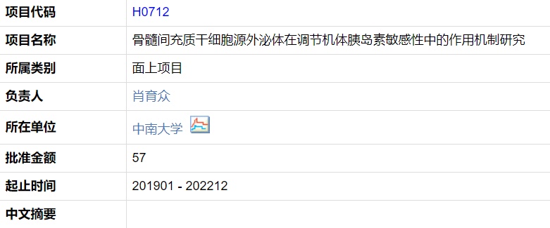 2017年肖育众博士毕业后,2018年就拿到了国家自然科学基金面上项目《骨髓间充质干细胞源外泌体在调节机体胰岛素敏感性中的作用机制研究》,项目起止时间为201901——202212。