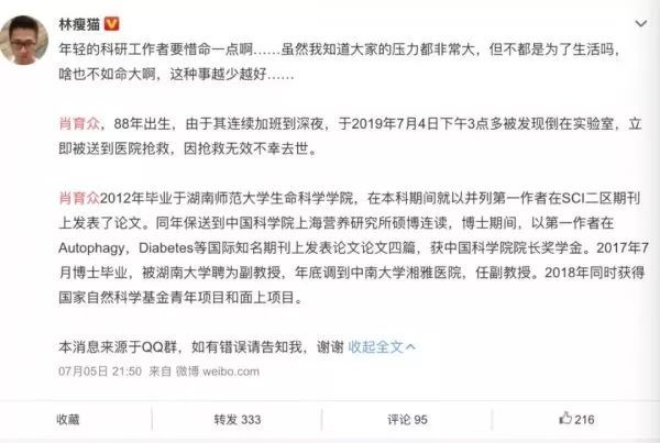 据媒体报道,7月4日下午3时,中科院博士、中南大学湘雅医院青年教师、副教授肖育众被发现晕倒在实验室,送医抢救无效去世!