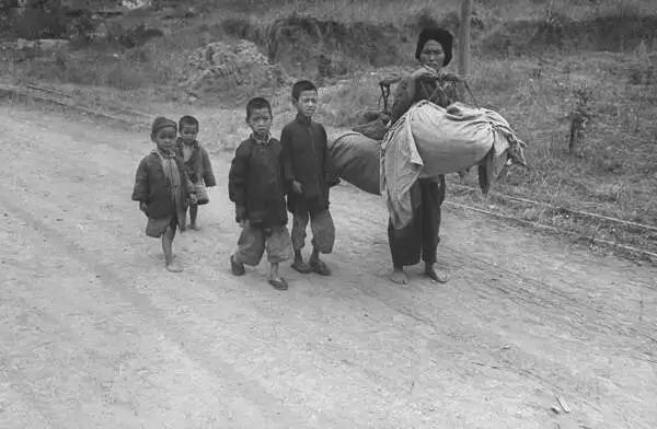 柳州的一家难民——一位母亲,带着四个幼小的孩子,赤足行走在不知名的路上