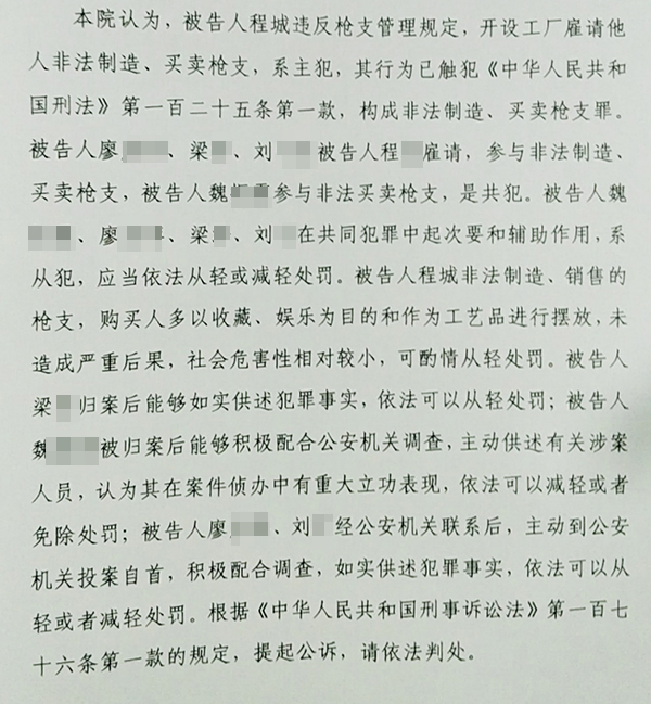 一审判决书还指出,程城非法制造、销售的枪支,购买人多以收藏、娱乐为目的和作为工艺品进行摆放,未造成严重后果,社会危害性相对较小,可依法酌情从轻处罚。此外,同案其余四人为从犯,起辅助作用,依法减轻处罚。