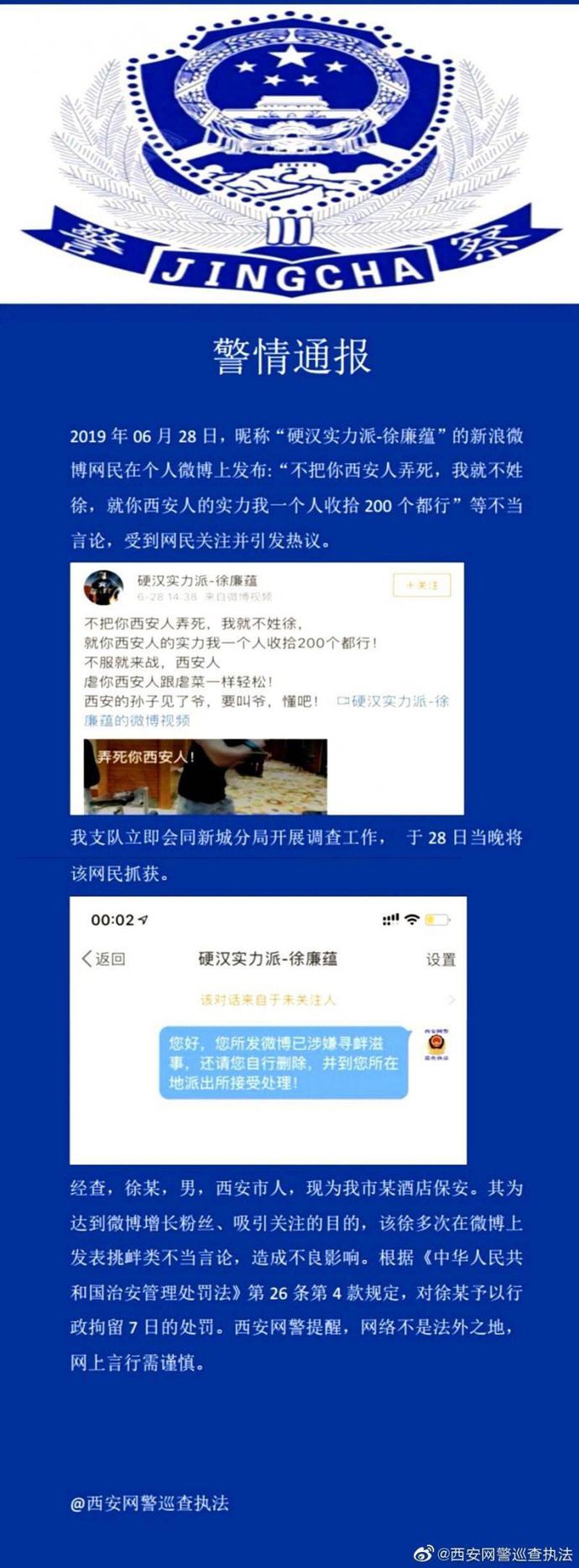 6月29日,西安公安局网络安全保卫支队微博通报称,6月28日,昵称“硬汉实力派-徐廉蕴”的网民在个人微博上发布:“不把你西安人弄死,我就不姓徐,就你西安人的实力我一个人收拾200个都行”等不当言论,受到网民关注并引发热议。