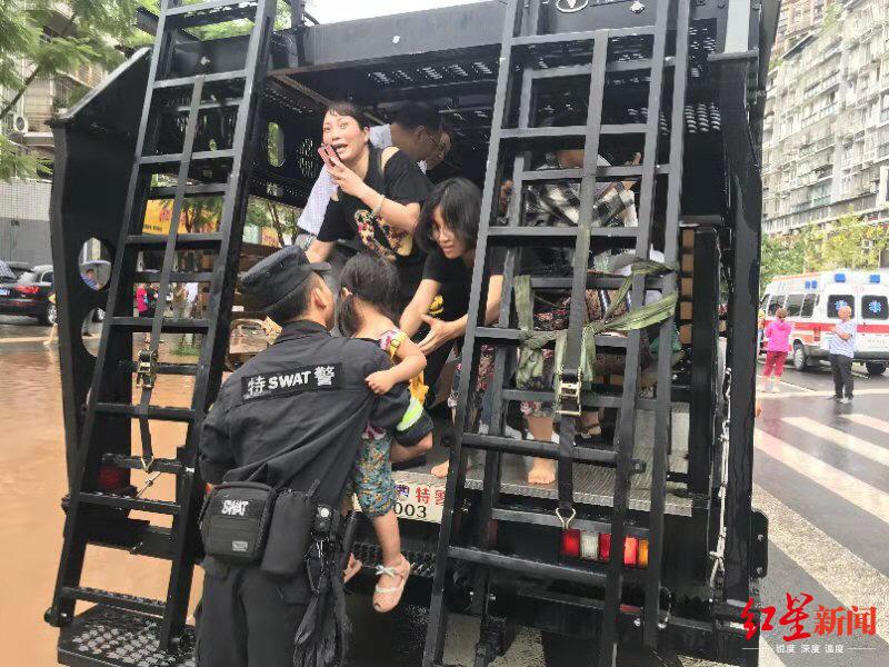 连续暴雨之后,8月6日一早,四川乐山市城区竹公溪附近的白燕路、春华路大面积被淹。上午9点左右,两辆黑压压的大车,碾着积水,毫不讲理地开了过来,张永孝一看,“哦,特警”,“我以为是警察出来执行任务,维持秩序的。”原来,乐山特警两辆酷似变形金刚的攀登突击车和防爆装甲车,充当起了摆渡车的角色,2个小时内转运了900人,被网友称为最酷的摆渡车。
