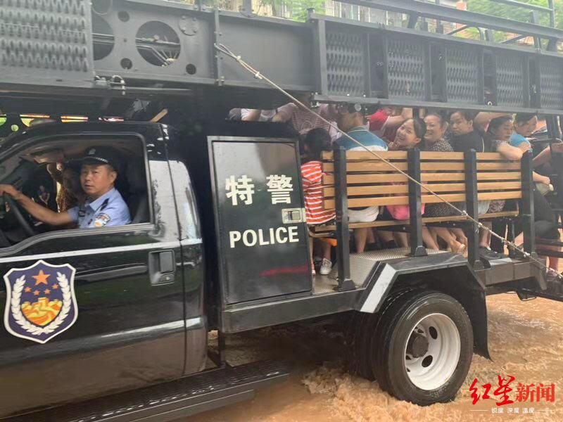 据乐山市公安局特巡警支队综合大队工作人员称,6日上午,攀登突击车搭载着特警队员,准备前往训练场进行常规的作战训练,经过白燕路时,遇到了大量被困在此的群众。“我们经过上报后,临时启用攀登突击车当做摆渡车,把群众送到安全的位置。”