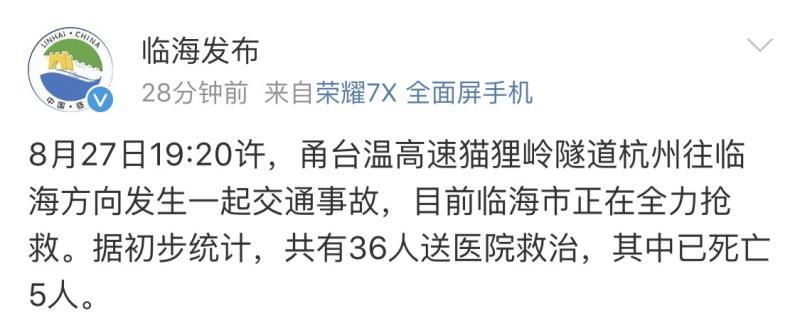 据浙江省临海市市委宣传部官方微博8月27日晚通报,27日19时20分许,当地甬台温高速猫狸岭隧道杭州往临海方向发生一起交通事故,目前临海市正在全力抢救。据初步统计,共有36人送医院救治,其中已死亡5人。