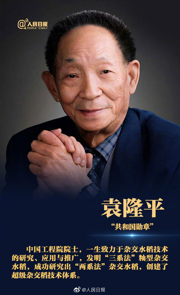获得过首届国家最高科学技术奖、“改革先锋”和未来科学大奖等荣誉的袁隆平,在新中国成立70周年之际,又获得“共和国勋章”。从第一期超级稻到第四期,以及每公顷16吨、17吨和18吨攻关目标的实现,中国杂交水稻的科研工作水平始终领先于世界。袁隆平一直认为,自己热爱的中国,既是他永攀新高的动力,也是所有梦想的终极目标。