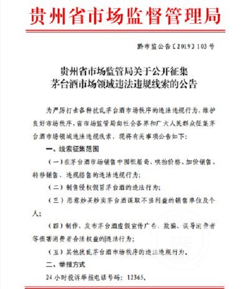 9月7日,上游新闻记者从贵州省市场监管局获悉,为严厉打击各种扰乱茅台酒市场秩序的违法违规行为,该局公开向社会各界征求茅台酒市场领域五种违法违规线索。茅台酒股份公司董事长李保芳曾公开表示,进入二季度以来,茅台酒价格上涨过快。有的地方流通价格高出1499元的市场指导价50%以上,严重偏离终端指导价。