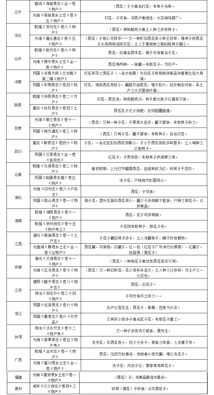 通过表1不但可知西瓜子在全国的利用情况,而且也说明了西瓜子在全国利用的时间更早且更为广泛,尤其北方各省西瓜子记载数量相当之多,笔者拣选相对时间较早及较典型者。总之在明清两代,没有其他瓜子能撼动西瓜子的地位。明清与今天的情况截然相反,我们说到嗑瓜子,一般都是指嗑西瓜子。