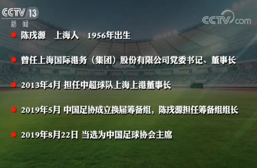 第二点,今天选出来的中国足球协会的主席是陈戌源,是原上港集团党委书记董事长;副主席的确跟体育总局大院是紧密相关的,中国足球协会的副主席是杜兆才、高洪波和孙雯。我们再来看大家当然要关注新的这个不是从体育总局大院里走出来的足协主席,陈戌源上海人1956年出生,曾任上海国际港务(集团)股份有限公司党委书记和董事长,2013年4月这位企业家开始跟中国足球有所联系,那就是因为担任了中超球队上海上港的董事长。2019年5月份,中国足协成立换届筹备组,陈戌源担任筹备组组长,因此媒体当时就普遍认为新一届的足协主席将是这位不是从体育总局大院里走出来的人,然后今天当选为中国足球协会的主席。那当新的足协的主席出现在公众的面前,新的足协也正式成立之后。