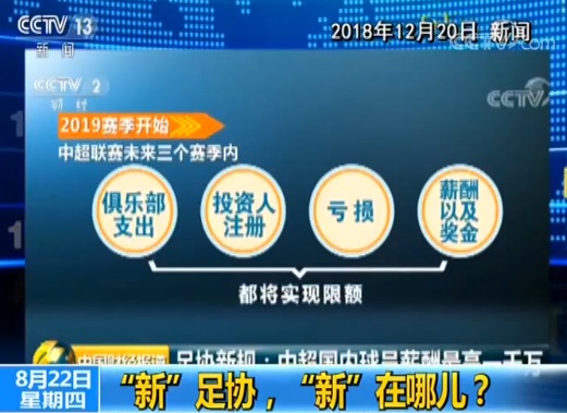 2018年12月20日:根据中国足协最新的规定,从2019赛季开始,中超联赛未来三个赛季内的俱乐部支出、投资人注册、亏损、薪酬以及奖金都将实现限额,同时把此作为各俱乐部的准入标准。同时中国足协还表示将建立严格的财务监管体系,严打阴阳合同等,确保政策顺利进行。