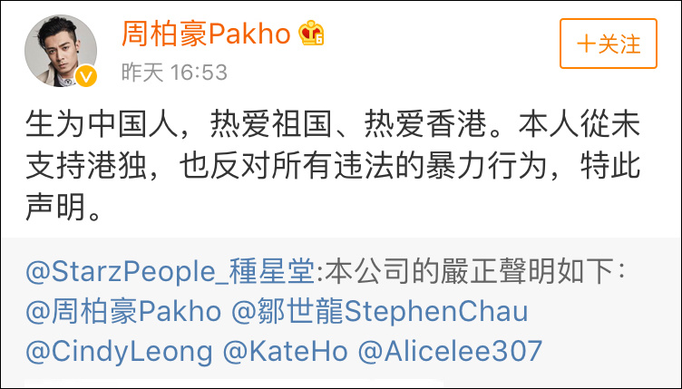 随后周柏豪转发了这条微博,再度强调自己“生为中国人,热爱祖国、热爱香港。”
