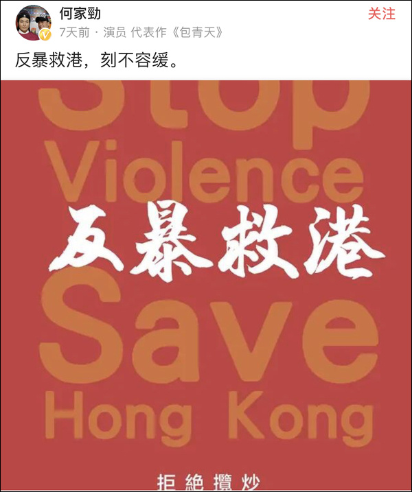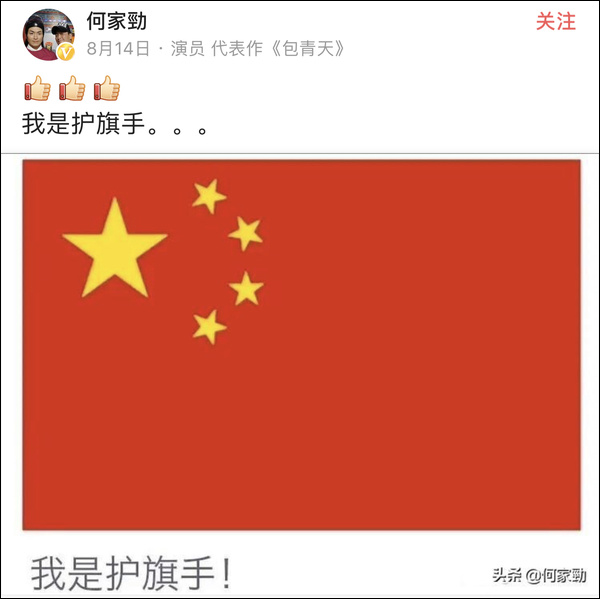 香港冲突发生至今,已经在影视圈中“退居二线”的何家劲多次在社交平台发表爱国爱港言论,不光争做国旗“护旗手”,也在不断呼吁“撑警救港”。