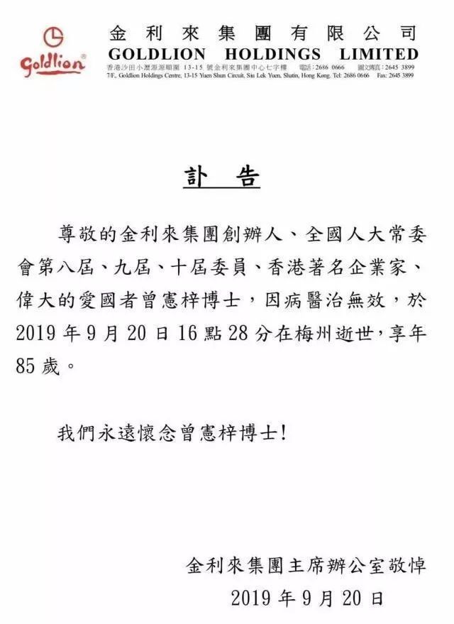 作为梅州客家人,生于斯归于斯,曾先生的人生旅程用一种平静的方式结束,但一幅幅一帧帧波澜壮阔的画面,却构成一本厚重的相簿,令人观来意味深长。1934年,曾宪梓生于广东梅州一个穷苦农民家庭,幼年时曾因家中贫困辍学务农。新中国成立后,他方得有机会,依靠助学金重新读书,一举考入中山大学。60年代,看准香港领带市场广阔的机遇,他在这里起步创业。从勤于行销、屡屡受挫,到潜心研究竞品、志做高档领带,再到商标设计字字珠玑,他与妻子筚路蓝缕,成立金利来公司,在1974年香港经济大萧条中反拼高档产品,逆市而上,终于独占鳌头,打开一片天地,产品远销海外。凭借狮子山下港人白手起家、生活总有希望的态度,曾宪梓先生在过去艰难的营商环境中仍旧打拼出来。这不禁令人慨叹,时过境迁,如今国家富强,继承这样一种积极的精神,在新时代“一带一路”和粤港澳大湾区的建设中寻找机会,每一位港人何愁没有一个光明的前景。