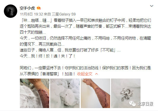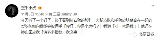10月1日至29日,清创。10月30日,植皮。11月5日,开始拆钉子。11月8日,拆除剩下的近百颗钉子。一条条微博,少则几十字,多则上千字,记录着小虎Sir一路走来的心路历程。