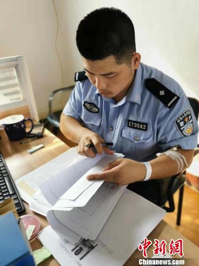 图为:民警赵延镇左手臂打着留置针回到派出所工作 天台公安供图