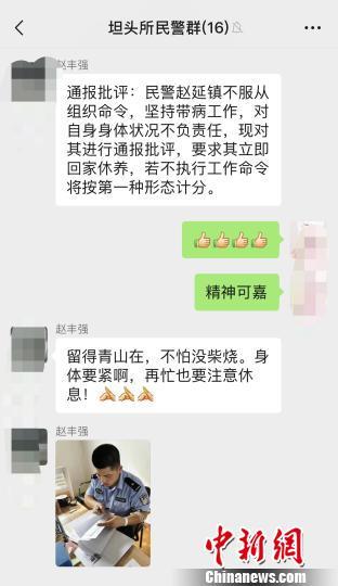 “通报批评:民警赵延镇不服从组织命令,坚持带病工作,对自身身体状况不负责任,现对其进行通报批评,要求其立即回家休养,若不执行工作命令将按第一种形态记分。”27日记者获悉,浙江省台州市天台县坦头派出所民警的工作群里,教导员赵丰强发出这则通报批评,要求民警赵延镇立即回家休养。