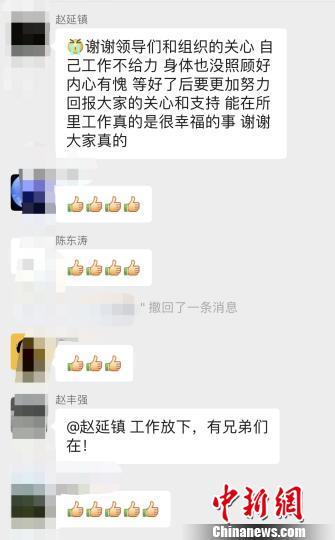 26日上午,赵延镇在医院里挂完盐水,下午又赶回所里加班。这一回,他跑出医院来派出所工作被教导员看到了。遇到这么“不服从”工作安排的民警,赵丰强还是第一次,于是在工作群里发出通报,批评了赵延镇。