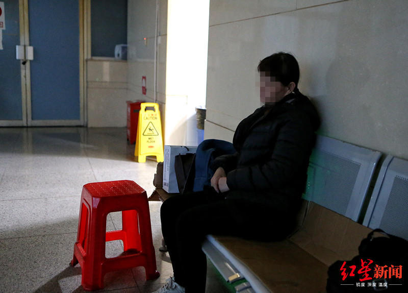 韩某的母亲庄女士坐在医院楼道休息凳上
