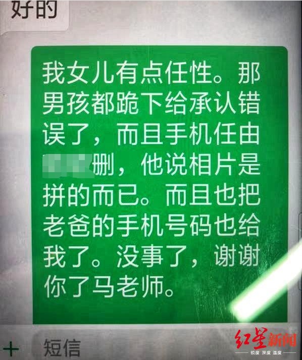 庄女士认为照片是偷拍,因为女儿说自己并不知情,是趁她睡着拍的。当时删除照片后,庄女士以为事情得到解决。记者在庄女士发给辅导员的短信中看到:“我女儿有点任性。那男孩都跪下给承认错误了,而且手机任由女儿删,他(男孩)说相片是拼的而已,而且也把老爸的手机号码也给我了。没事了,谢谢你了马老师。”