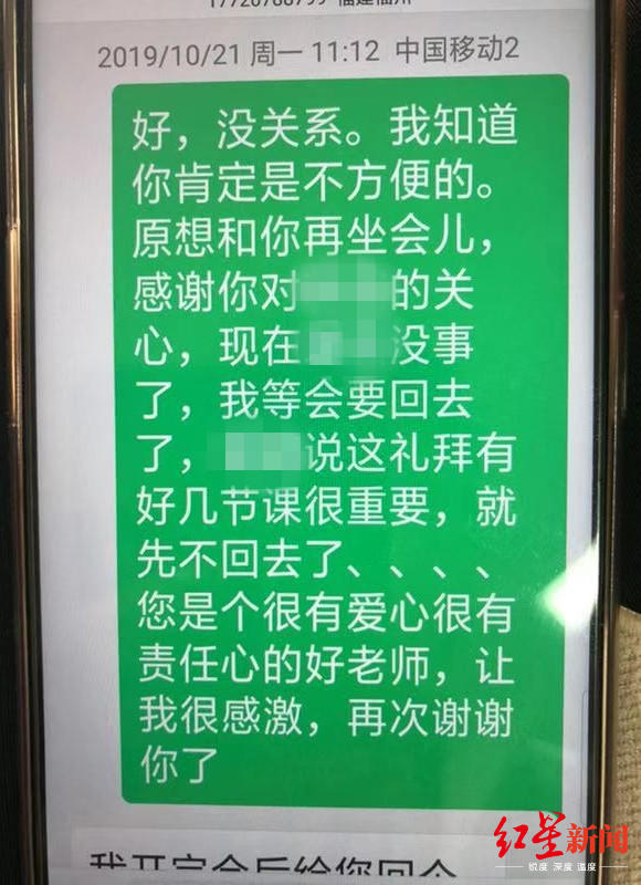 从庄女士与辅导员的短信对话可以看到,庄女士感谢了辅导员的关心,称辅导员“您是个很有爱心很有责任心的好老师,让我很感激,女儿没事了,我就先回去了。”可是,10月28日晚,却收到辅导员告知女儿不在宿舍的短信和电话。