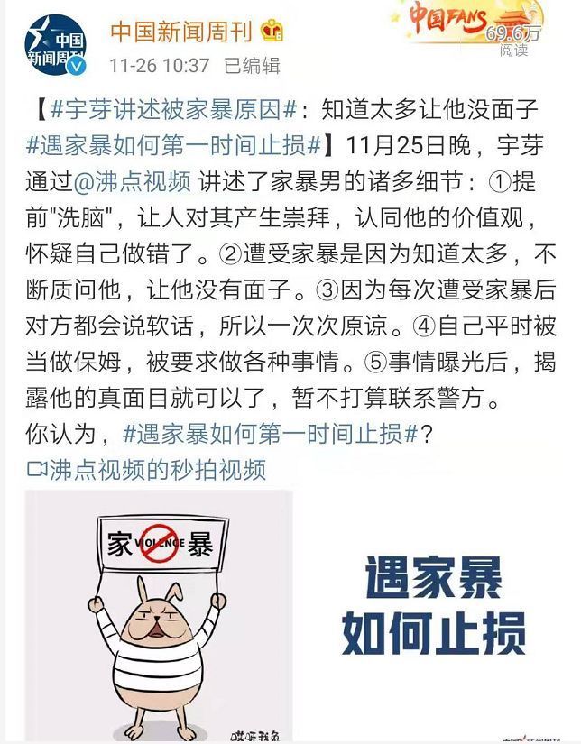 宇芽的遭遇也与此相似,事后她最悔恨的也是每一次家暴后都选择原谅@沱沱的风魔教,没有选择第一时间报警验伤保留证据。但在遭遇精神控制、三观洗脑以及5次家暴后,宇芽彻底清醒,与渣男前男友分手,并勇敢地站出来,为自己也为更多受害者发声。视频发出后, @沱沱的风魔教的前任们也指出他此前的种种施暴行为。