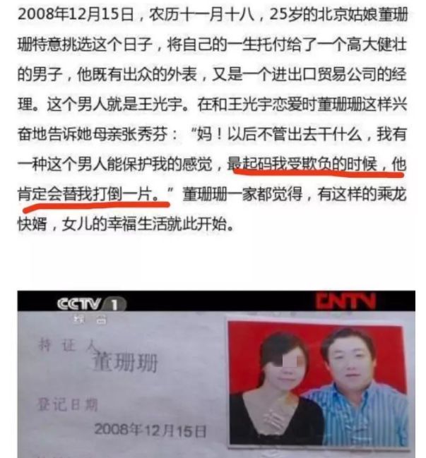 2009年,董珊珊被家暴致死案惊动全国。北京女孩董珊珊被新婚10个月的丈夫王光宇殴打致死。