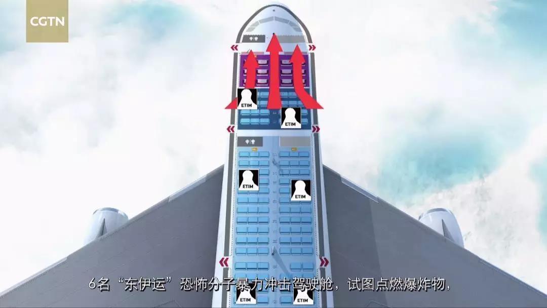 6名“东伊运”恐怖分子暴力冲击驾驶舱,试图点燃爆炸物,计划效仿“9·11”事件发动恐怖袭击。机组人员和乘客最终制服了6名恐怖分子。