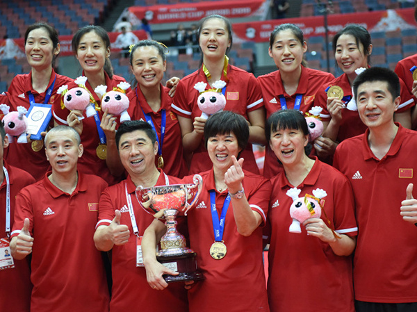 中国女排在世界杯夺冠后合影。 新华社记者 贺灿铃 摄