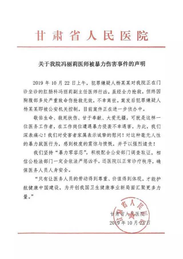 10月22日上午,犯罪嫌疑人杨某某(男,54岁)在甘肃省人民医院肛肠科,持刀对女医生冯丽莉行凶,致其胸腹部多处严重致命伤。虽经全力抢救,她仍不幸离世。