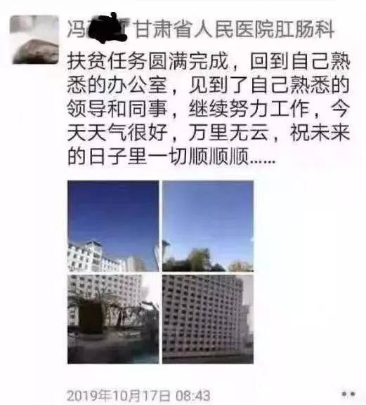 这位医生提供的截图显示,10月17日早上,冯丽莉发布朋友圈称,“扶贫任务圆满完成,回到自己熟悉的办公室,见到了自己熟悉的领导和同事,继续努力工作,今天天气很好,万里无云,祝未来的日子里一切顺顺顺……”