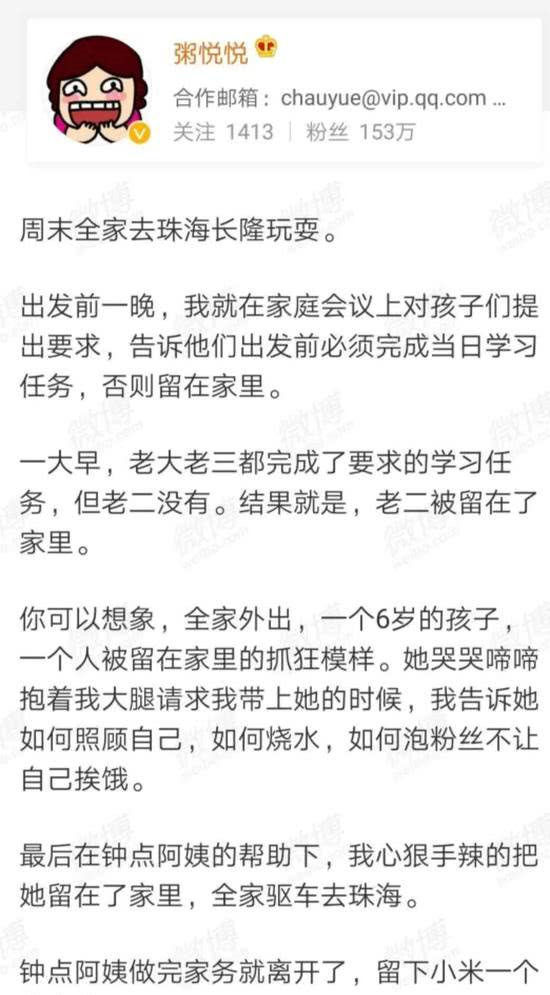 近日,微博上一位百万粉丝的育儿博主“粥悦悦”引发了热议。因为自己6岁的女儿没有完成“学习任务”,按照之前的约定,全家其他人开车去了珠海长隆游玩,唯独把女儿一个人留在了广州的家里 。
