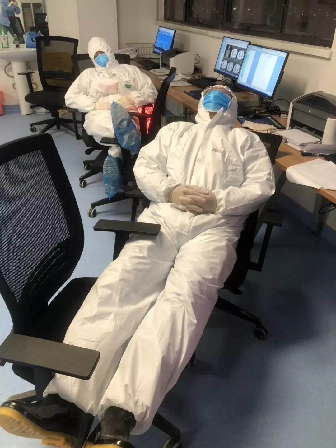 现在,大家真的都很拼,医生们累了就穿着防护服在椅子上靠一靠,但我们都抱着必胜的信念,一定能打赢这场战争。
