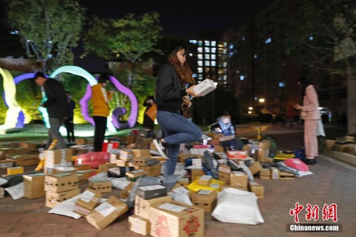 资料图:11月15日晚,在上海虹桥乐贤居人才公寓,民众正在小区广场上取快递。殷立勤 摄