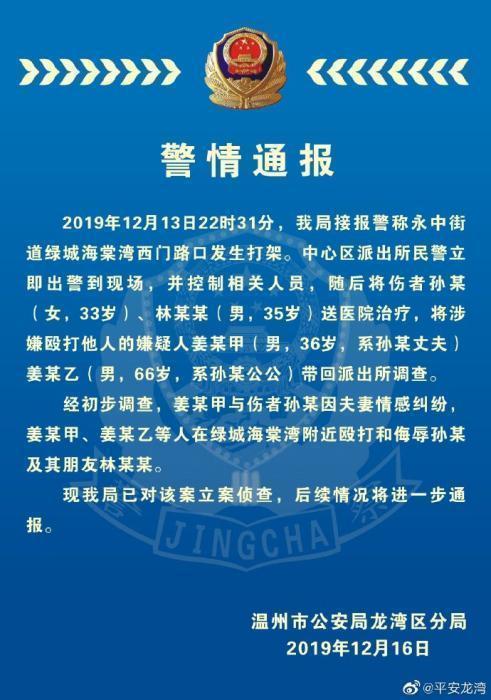 通报称,2019年12月13日22时31分,龙湾公安分局接报警称永中街道绿城海棠湾西门路口发生打架。中心区派出所民警立即出警到现场,并控制相关人员,随后将伤者孙某(女,33岁)、林某某(男,35岁)送医院治疗,将涉嫌殴打他人的嫌疑人姜某甲(男,36岁,系孙某丈夫)姜某乙(男,66岁,系孙某公公)带回派出所调查。