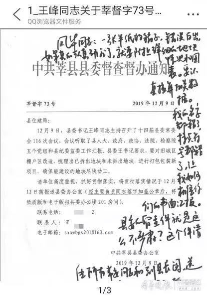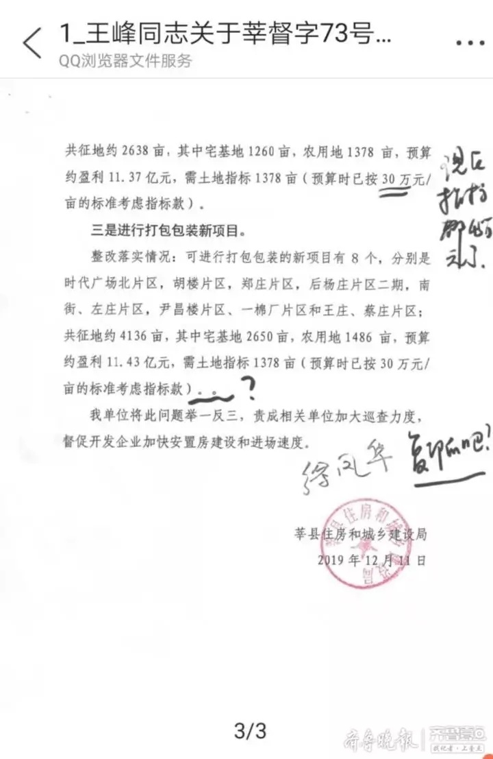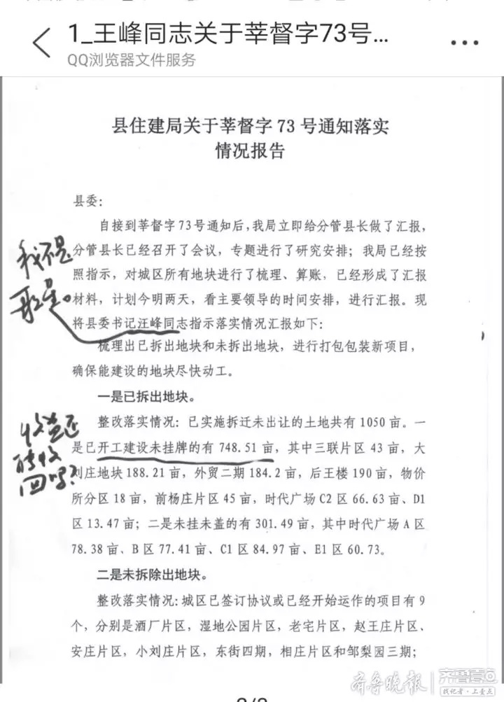 “凤华同志:一张半纸的稿子,错误百出,如果真的研究了,就要附上详细的地块情况和图表,要认真核算相关数据。我的名字都错了,标点符号都错了,让我如何相信你们的书面汇报。县委的督查件就是这么不严肃?这个件请传所有常委同志和副县长阅,工作作风,岂是小事。”在这份《县住建局关于莘督字73号通知落实情况报告》上,莘县县委书记王峰作出了这样的批示,还在报告上错误的名字处标注“我不是歌星”。