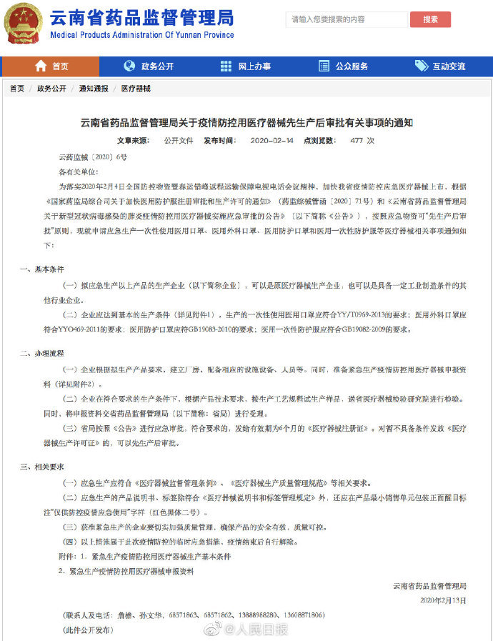 日前,云南省药品监督管理局印发通知,按照应急物资可“先生产后审批”原则,明确疫情防控用一次性使用医用口罩、医用外科口罩、医用防护口罩和医用一次性防护服等医疗物资,生产企业具备生产条件、试生产样品合格,向省药监局申请,符合要求的即可生产上市,缓解我省疫情防控物资供给紧张,特别是防护用医疗器械严重短缺的问题。