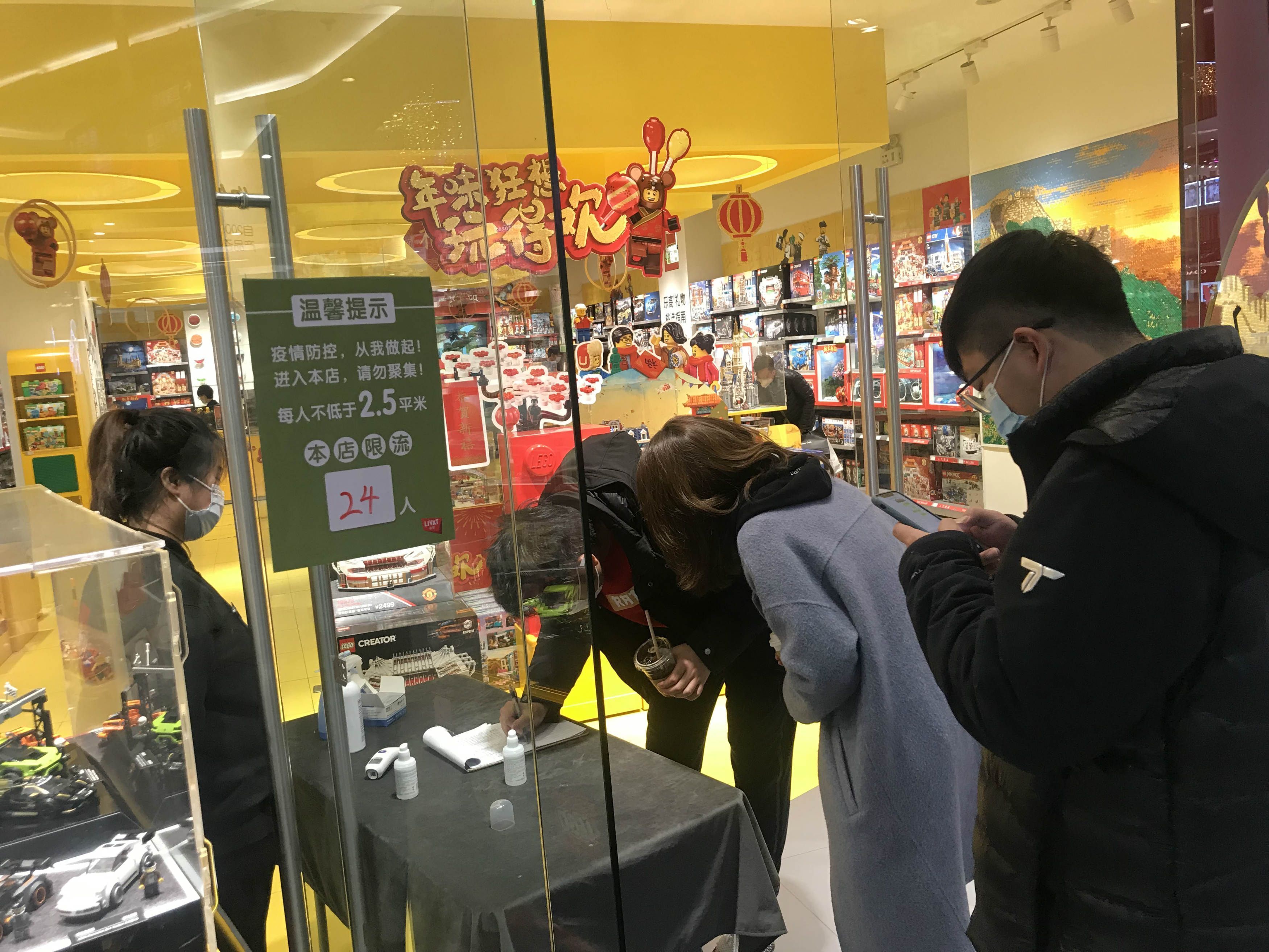 在商场一层、二层,仅有少数门店还没开门,三层的一小部分儿童早教机构、母婴用品门店、电影院等暂停营业。新京报记者在现场看到,每家店门口都备有消毒产品,并贴有限流标识,而迪卡侬、优衣库、Zara、一条、乐高等不少门店门口,都有排队等待进场的顾客。此外,大部分门店都需要二次测温,有的门店还需要再次填写姓名、电话等个人资料。