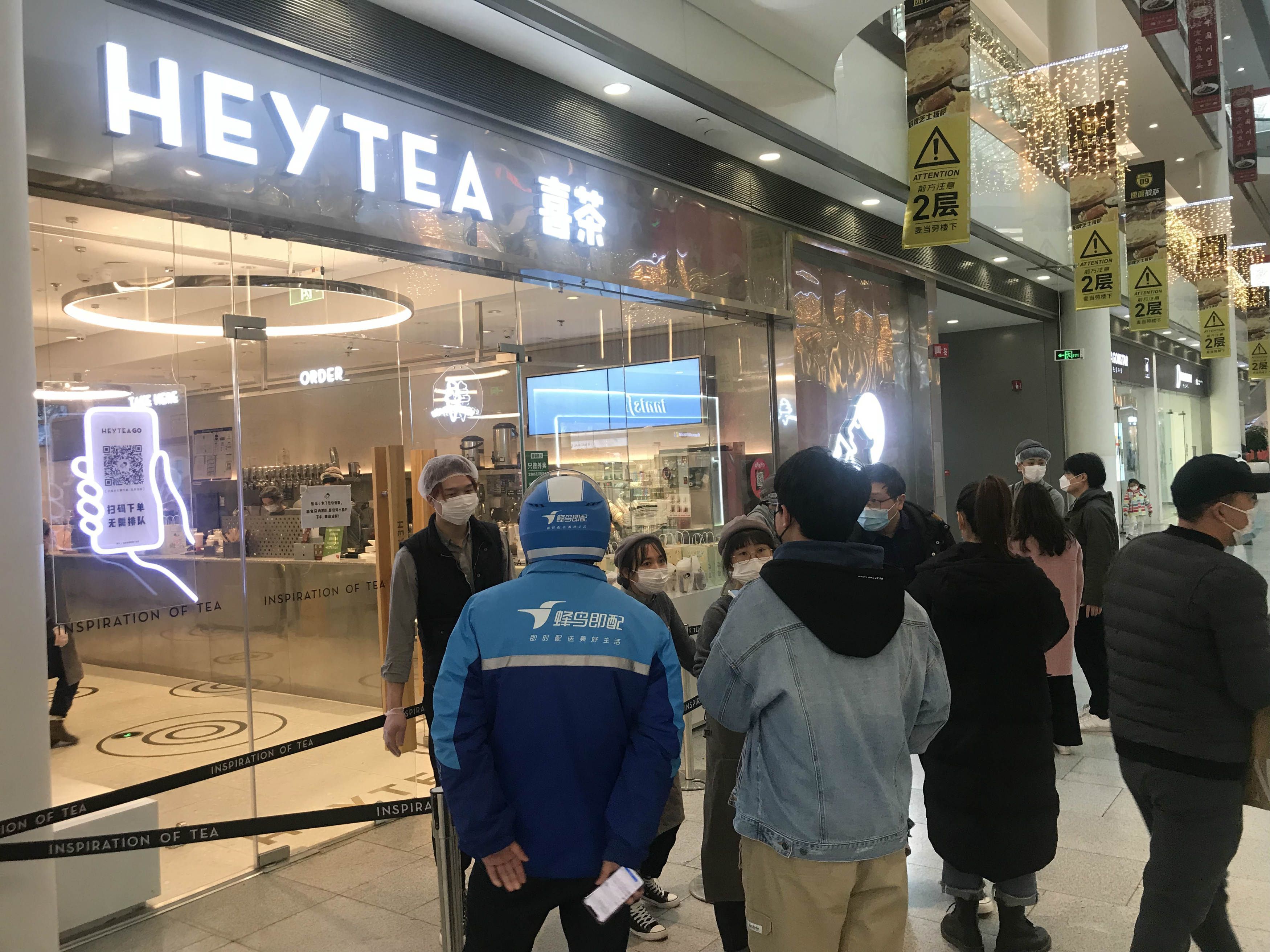 目前,北京荟聚中心各餐饮租户仅提供外卖服务,暂时不提供堂食。在商场内的餐饮门店中,一些适合打包带走的小食、甜品、奶茶饮品等门店门口聚集了不少顾客。在喜茶店门口,一直有工作人员负责指导顾客在线下单、疏散询问聚集的顾客。该工作人员表示,下单人数较多时出现售罄,顾客需等待20分钟再刷新下单。有消费者称,自己大约在一个小时前下单,在商场其他门店买完东西才返回来取商品。