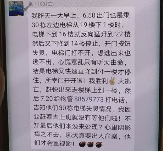 小区业主:从19楼下到1楼时,电梯下到16楼时就反向猛升到22楼,然后又下降到14楼停止,开门按钮失灵,电梯门打不开,当时心慌意乱只有听天由命。