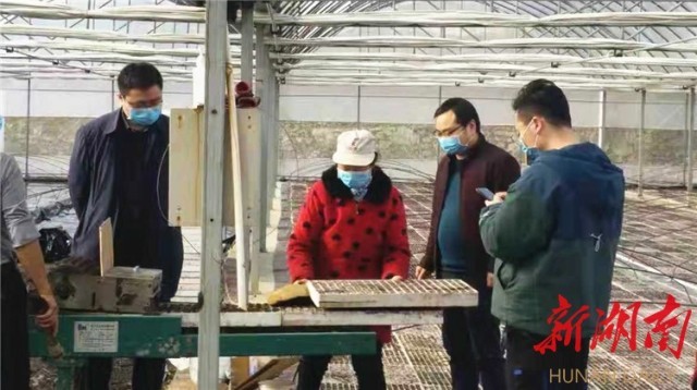 (镇党委书记覃浩带队到烟叶合作社育苗大棚为群众送口罩、消毒酒精提醒群众在抓好疫情防控的同时抓好产业发展。)