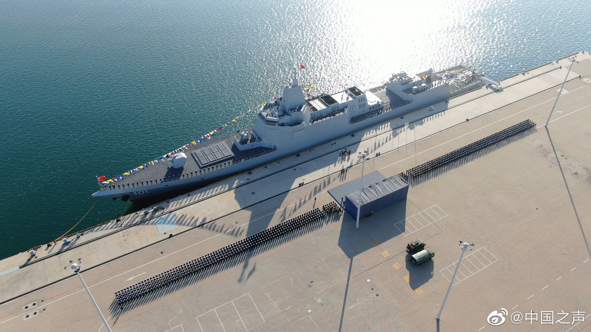 中国人民解放军海军055型驱逐舰首舰南昌舰归建入列仪式12日上午在青岛某军港码头举行。