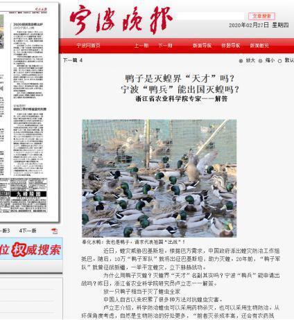 27日一早,宁波晚报发布的一篇文章《鸭子是灭蝗界“天才”吗?宁波“鸭兵”能出国灭蝗吗?浙江省农业科学院专家一一解答》让“浙江10万只鸭子出征巴基斯坦灭蝗”冲上微博热搜第一,鸭鸭们从睡梦中惊醒:鸭们这是混出头要出国了?