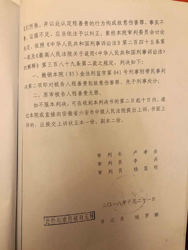 直至2018年10月,金寨县法院作出第四次判决,最终认定程善贵无罪。无罪判决书显示,金寨县法院认为,现有证据难以证明程善芝头部外伤系程善贵殴打所致,因此原审认定故意伤害罪“事实不清、证据不足”。