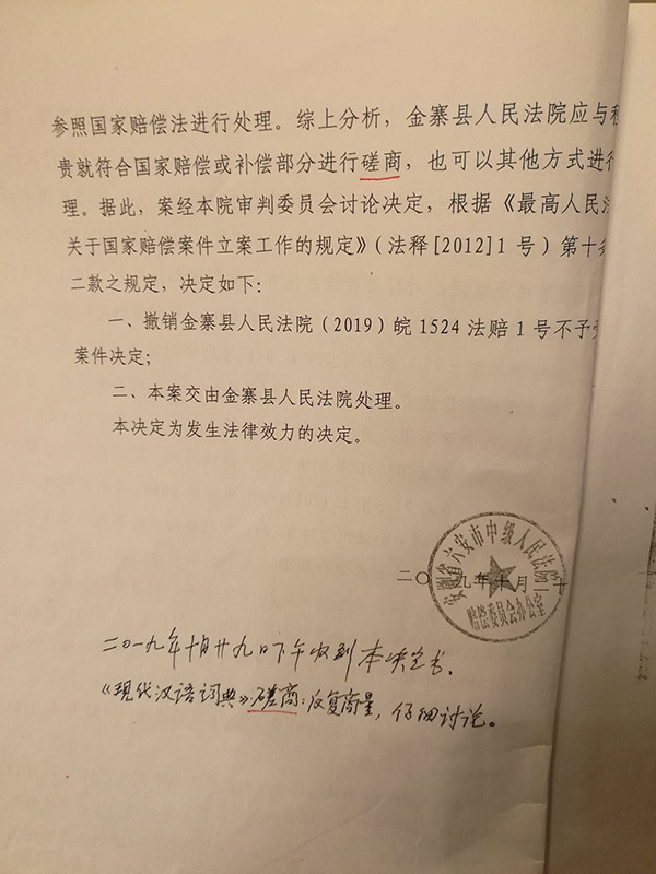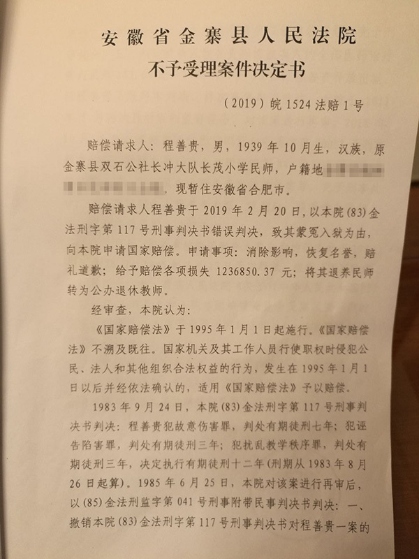 2019年10月,六安市中级人民法院决定,撤销金寨县法院不予受理决定,要求该院与程善贵就符合国家赔偿或补偿部分进行磋商。