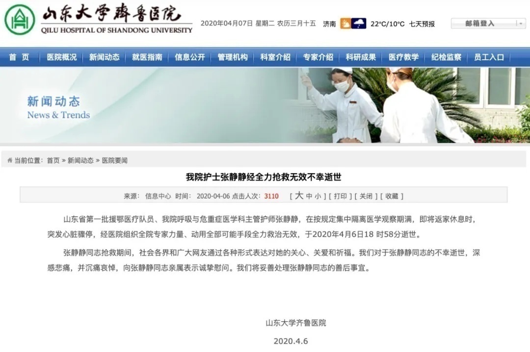 4月5日,山东省第一批援鄂医疗队员张静静,在按规定集中隔离医学观察期满,即将返家休息时,突发心脏骤停。经医院组织全力救治无效,张静静于4月6日18时58分逝世。