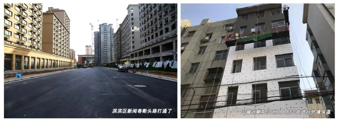 △左图:淇滨区新闻巷断头路打通了;右图:山城区朝阳小区工人们正在进行外墙保温。