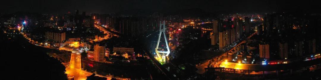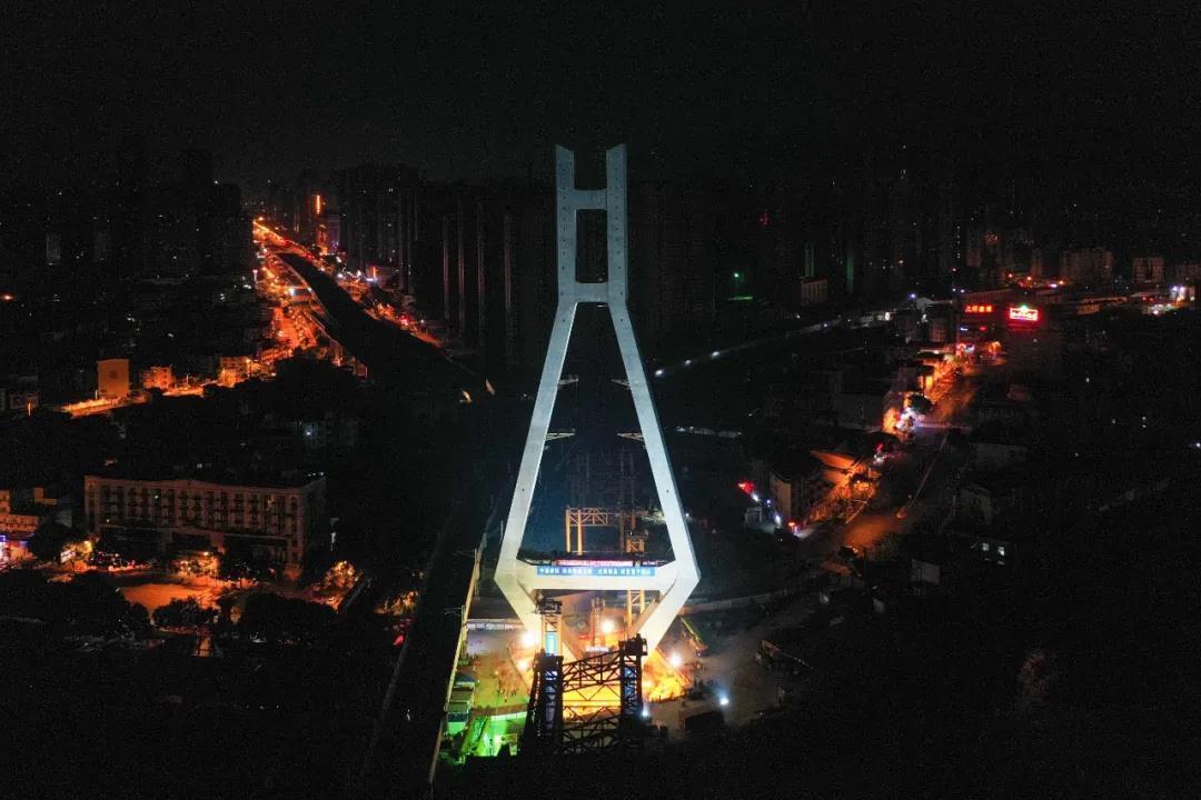 为最大限度保障行车安全,当日,“独塔单转”作业在凌晨进行。施工现场灯光璀璨,约1.6万吨“宝石”型扁平状桥梁主塔,以每分钟一度的速度,缓缓地进行原地旋转,最终圆满完成逆时针69度转体,在夜空中上演一场精彩的“空中芭蕾”。