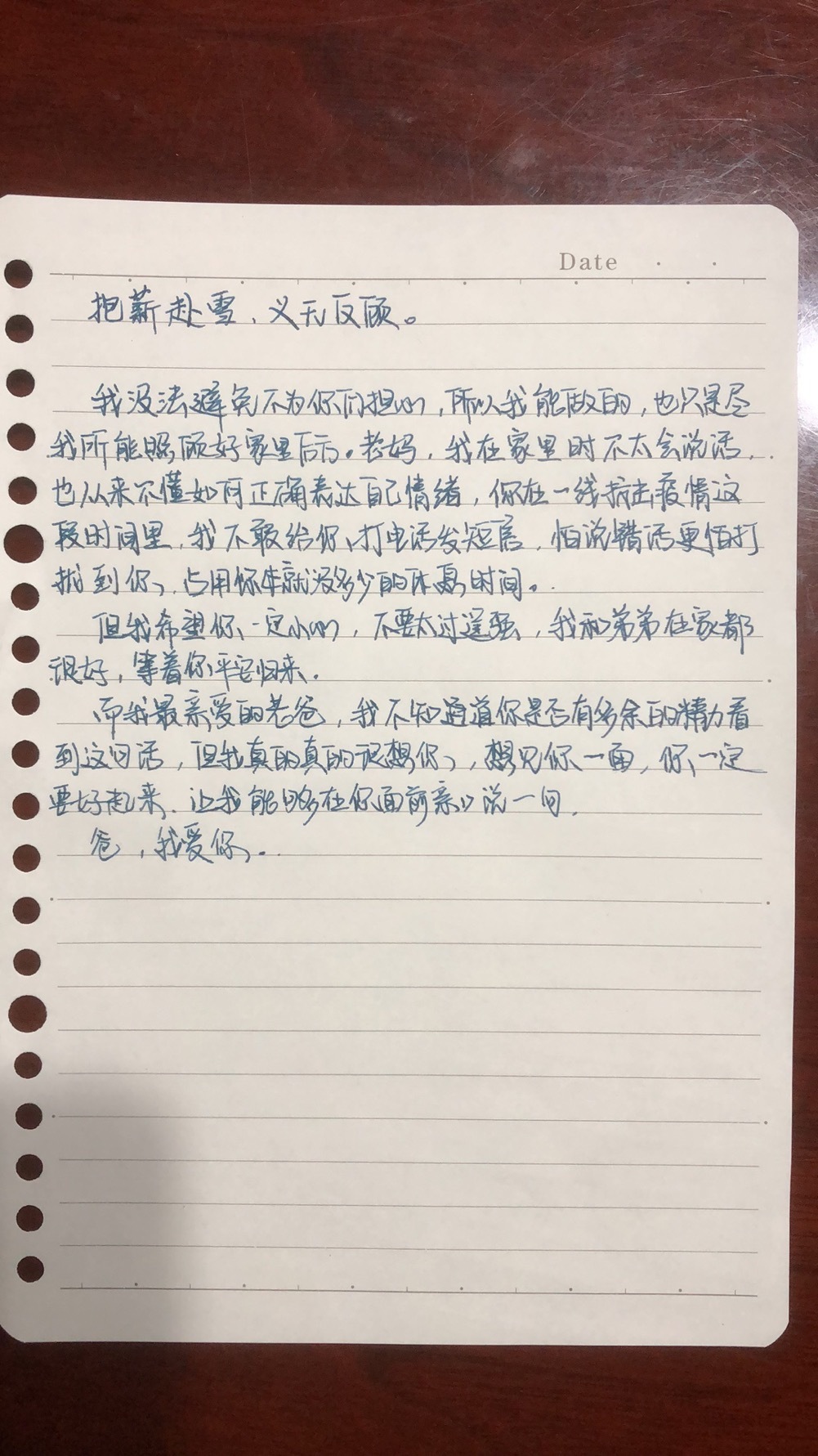 刘智明生病期间,女儿曾写过一封信,表达对父亲的牵挂与思念。