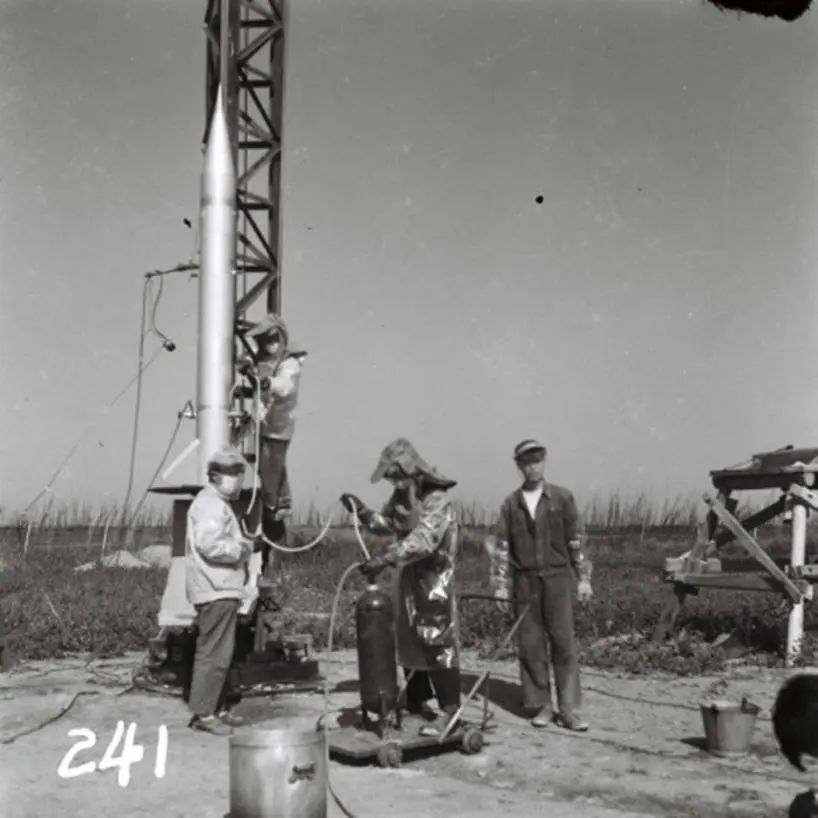 1960年2月,在上海市南汇区简易机场,研制人员正用自行车打气筒作为压力源,为我国第一枚液体燃料探空火箭T7M加注推进剂。2月19日T-7M探空火箭成功发射,开启了我国飞向太空的第一步。