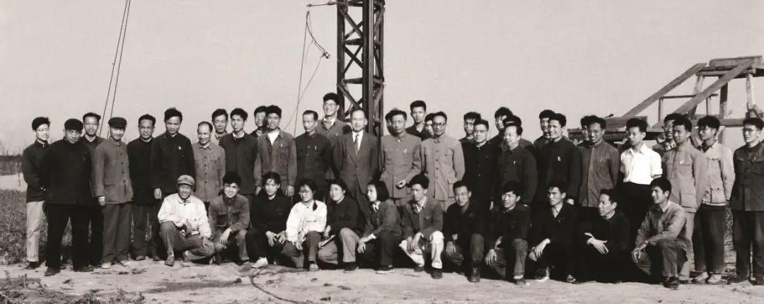 1960年4月17日,在上海市南汇区探空火箭发射架前,钱学森、王希季等海外归国专家与参加发射任务的科研人员合影。